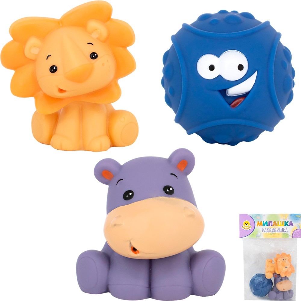 Комплектация: мячик с забавной мордочкой (d=6 см) – 1 шт., бегемотик (высота 7 см) – 1 шт., львенок (7 см) – 1 шт.