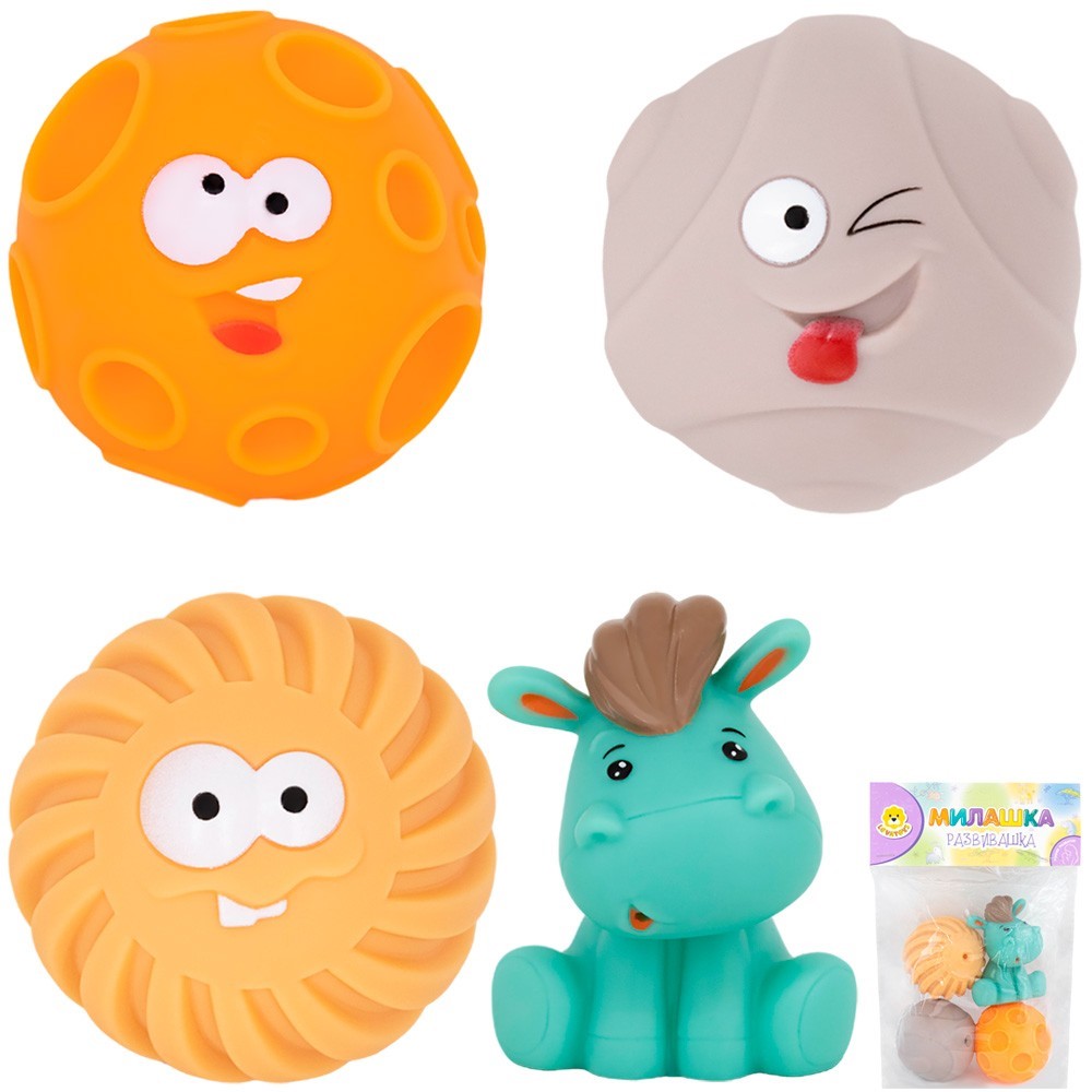 Комплектация: резиновые тактильные мячики (d=6 см) – 3 шт., ослик (высота 8 см) – 1 шт.