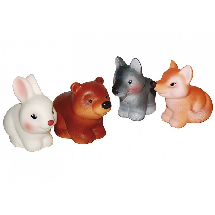 Четыре фигурки лесных зверей - зайца, волка, лисы и медведя. Они соразмерны руке ребенка, приятны на ощупь и помогают развивать мелкую моторику и тактильные ощущения. С таким набором ребенку не будет скучно в ванной и на прогулке, а благодаря качественному материалу изготовления, игрушки просты в уходе.