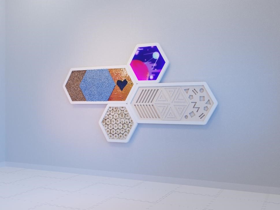Состоит из четырёх шестигранных панелей, покрытых различными материалами: ворс, пайетки, дерево, металл, акриловый пластик, зеркало, натуральный камень. Благодаря различным фактурам, рельефам, звукам и температурным ощущениям ребёнок приобретает новый тактильный опыт, учится классифицировать материалы по отдельным категориям и сравнивать их свойства. Это хорошо отражается на развитии малышей, ведь чем разнообразнее палитра тактильных ощущений, тем лучше развивается мозг, в частности, зоны, отвечающие за анализ информации и развитие речи.