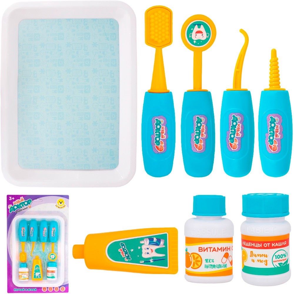 Комплектация: поднос (17,5 х 24,5 см) – 1 шт., зубная паста (3,5 х 8,5 см) – 1 шт., зубная щетка (14 х 3 см) – 1 шт., стоматологическое зеркало (13,5 х 3,5 см) – 1 шт., зонд стоматологический (12 х 3 см) – 1 шт., сверло (11 х 3 см) – 1 шт., баночка с надписью "витамины" (3,5 х 6 см) – 1 шт., баночка с надписью "леденцы от кашля" (3,5 х 6 см) – 1 шт.