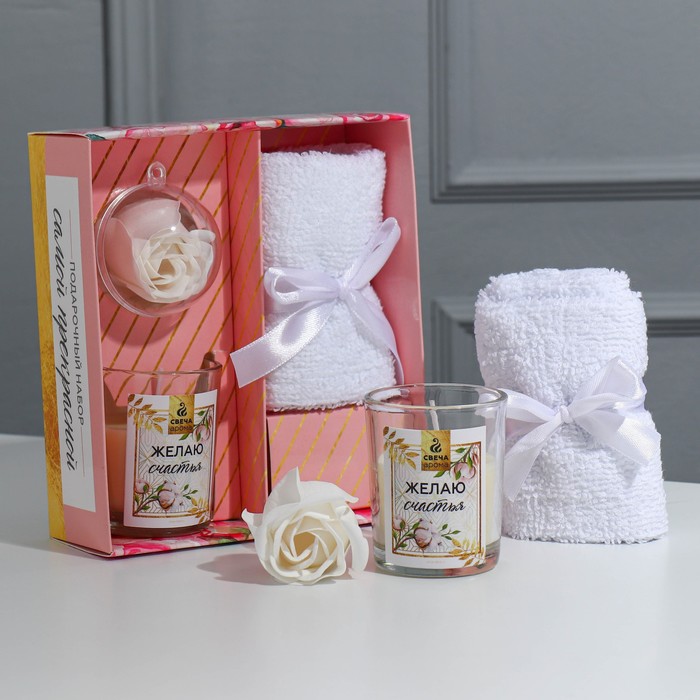 Набор: свеча, мыльные лепестки и полотенце «Желаю счастья!», аромат ваниль