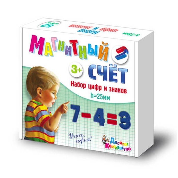 Выучить цифры и научиться самым простым арифметическим операциям поможет набор из 52 цветных цифр и знаков, высотой 2,5 см. В игровой форме процесс обучения происходит легко и непринужденно, и ребенок с радостью воспринимает новые знания. Цифры и знаки хорошо крепятся к магнитной доске, а так же к любой гладкой металлической поверхности. Перед началом использования следует установить магнитные вкладыши гладкой поверхностью наружу.