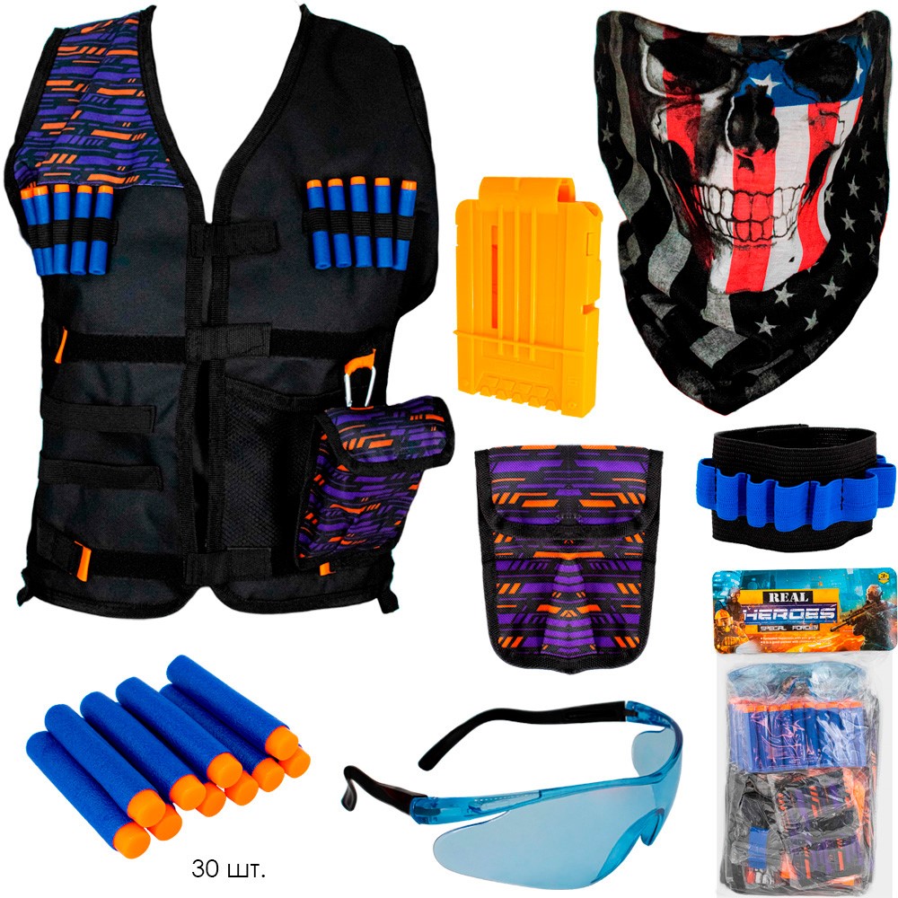 Комплектация: жилет - 1 шт., очки - 1 шт., бандана - 1 шт., пули - 10 шт., держатель пуль - 2 шт., сумка на карабине - 1 шт.
