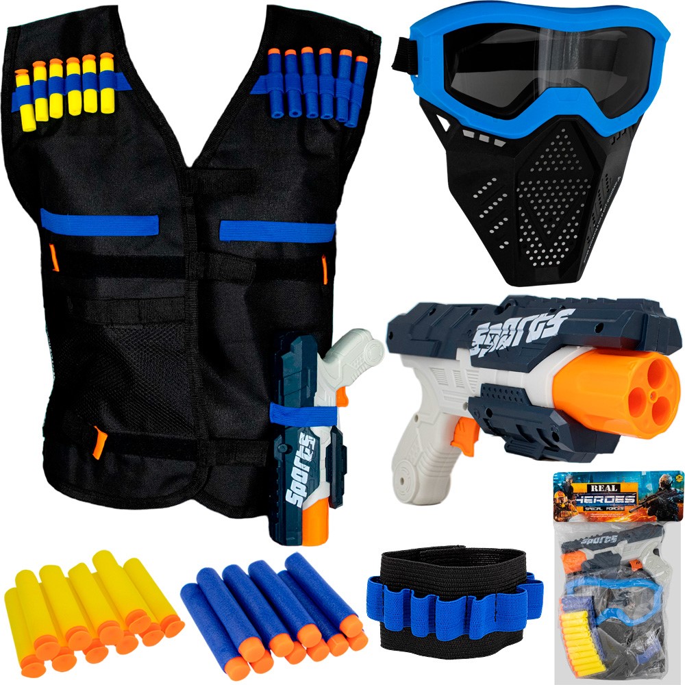 Комплектация: жилет - 1 шт., маска - 1 шт., пули - 20 шт., держатель пуль - 1 шт., бластер - 1 шт.