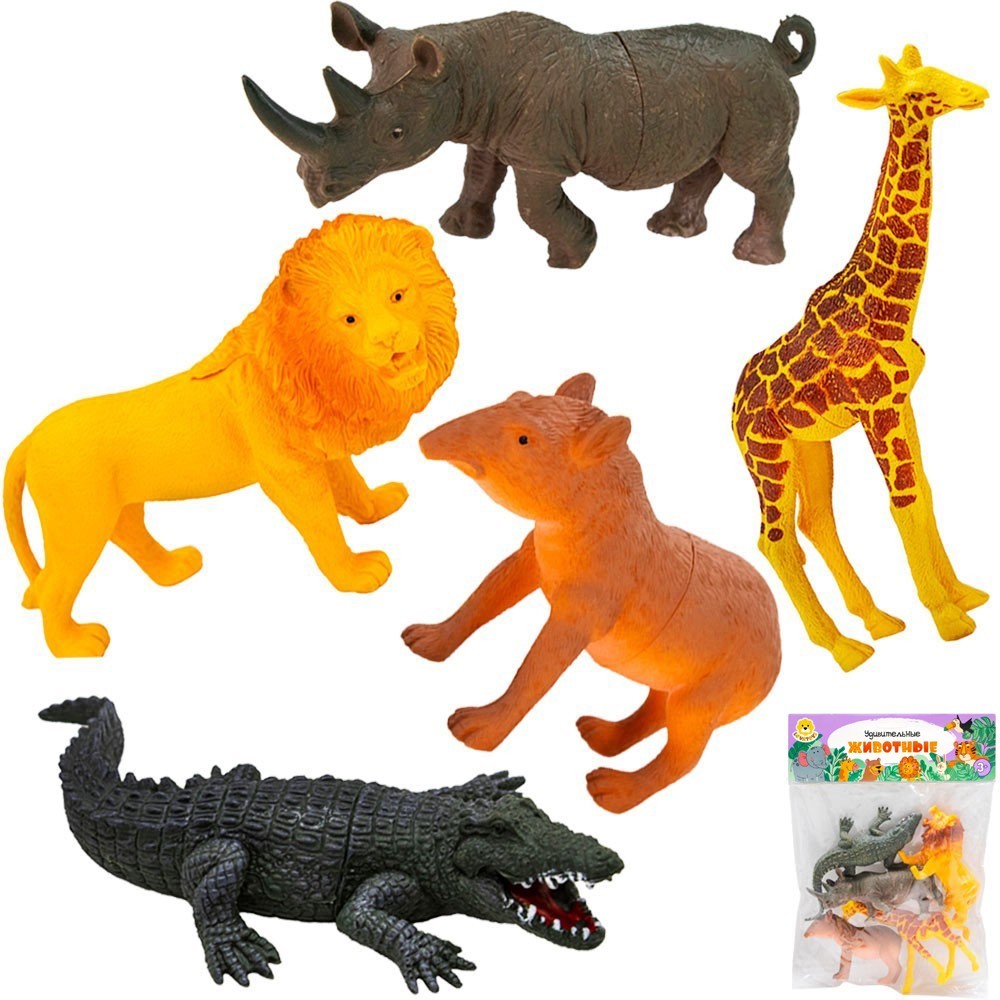 Комплектация: лев (14 х 7 см) - 1 шт., носорог (14 х 6,5 см) - 1 шт., тапир (10,5 х 7,5 см) - 1 шт., жираф (14 х 11 см) - 1 шт., крокодил (16 х 7,5 см) - 1 шт.