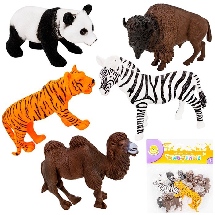Комплектация: панда (9,5 х 6,5 х 5 см) - 1 шт., тигр (13 х 6,5 х 3 см) - 1 шт., верблюд (11 х 7,5 х 4 см) - 1 шт., зебра (12 х 9,5 х 5 см) - 1 шт., зубр (9,5 х 6,5 х 2,5 см) - 1 шт.