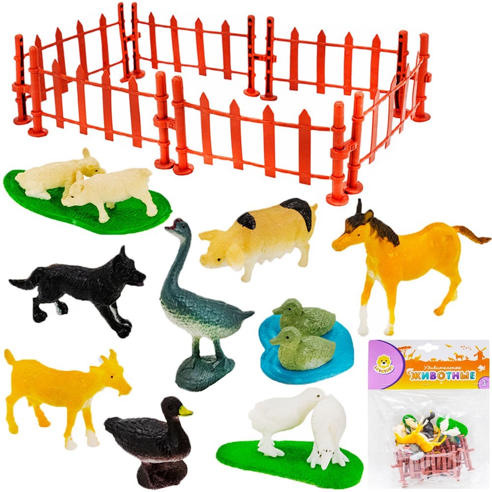 Комплектация: козел (4 х 5 см) - 1 шт., утка (4,5 х 4 см)- 1 шт., цыпленок (4,5 х 2 см) - 1 шт., собака (6 х 4 см) - 1 шт., гусь (4,5 х 4 см) - 1 шт., утята (4 х 2 см) - 2 шт., жеребенок (7 х 6 см) - 1 шт., поросенок (5 х 3 см) - 1 шт., забор/ограждение (9 х 4,5 см) - 6 шт.