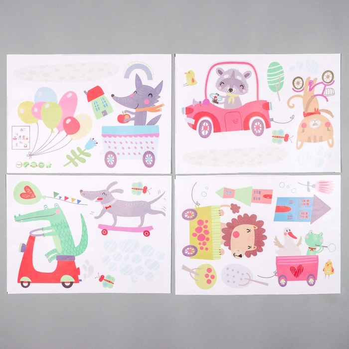 Наклейка интерьерная цветная «Зверята и транспорт», 25×35 см, набор 4 листа