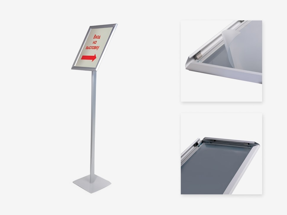 Напольный стенд A3 — это удобное и профессиональное решение для информирования посетителей, размещения временной информации и визуальной навигации. Стенд оснащен алюминиевой рамкой с прижимными сторонами, что позволяет быстро и легко заменять материалы без инструментов. Просто откройте края рамки, замените изображение и закройте обратно.