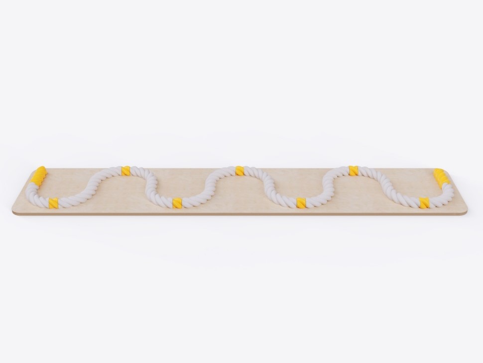 Гимнастический снаряд для детей дошкольного возраста. Подходит для выполнения упражнений на координацию и баланс, для укрепления мышц корпуса, ног и стоп. Ограниченная поверхность доски и зафиксированный на ее поверхности канат — тренажер для ловкости и равновесия.