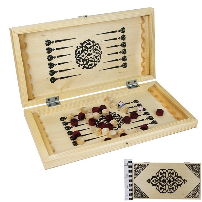 Занимательная настольная игра обязательно понравится как детям, так и взрослым. Это отличный подарок, который заинтересует Вашего ребёнка. Настольная игра "Нарды" представляет собой шкатулку, выполненную из фанеры, оформленную узором, и закрывающуюся на замочек. Внутренняя часть шкатулки представляет собой игровое поле. Нарды могут стать отличным подарком каждому, независимо от ситуации и возраста. Нарды - настольная игра для двух игроков на специальной доске, разделённой на две половины. Цель игры - бросая кости и передвигая шашки в соответствии с выпавшими очками, пройти шашками полный круг по доске, зайти ими в свой дом и выбросить их за доску раньше, чем это сделает противник.