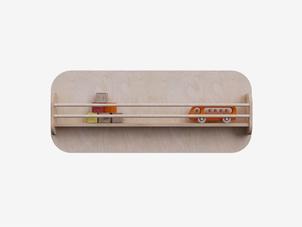 Полка для хранения дидактических, развивающих и рабочих материалов для демонстрации и обеспечения более простого и быстрого доступа. Горизонтальные перекладины препятствуют падению с полки элементов ее наполнения. Конструкция является не только практичным решением, но и стильным и экологичным украшением пространства.
