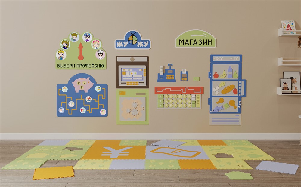 Развивайте сенсорные навыки детей! Съемные, вращающиеся, разноцветные детали деткам хочется трогать и#nbsp;изучать. Сочетайте занятие с#nbsp;панелью и#nbsp;тематическим ковриком! ОВЗ: используем «модифицированный шрифт брайля"#nbsp;для цифр. Элементы для игрового изучения банкомата: сейф с#nbsp;имитацией замка, скрытая панель с#nbsp;денежными средствами, имитация камеры, съемные купюры, монеты, банковская карта. Первое знакомство с#nbsp;профессиями: дети выбирают профессии, а#nbsp;педагог рассказывает о#nbsp;них! В#nbsp;игровой форме поиграйте с#nbsp;«деньгами»: монеты, купюры, чеки для обучения основам управления финансами, включая понятия стоимости, сдачи и#nbsp;бюджета. Обучите детей сортировке в#nbsp;холодильнике: 2 полки и#nbsp;1 морозилка для размещения магнитных продуктов! Развитие коммуникативных навыков при игре в#nbsp;продавцов и#nbsp;покупателей! Используйте коврик на#nbsp;занятиях по#nbsp;финансовой грамотности: съемные валюты, копилки, кошельки! Подходит#nbsp;для занятий с#nbsp;детьми с#nbsp;ОВЗ по#nbsp;программе «Доступная среда». Размер собранной панели: