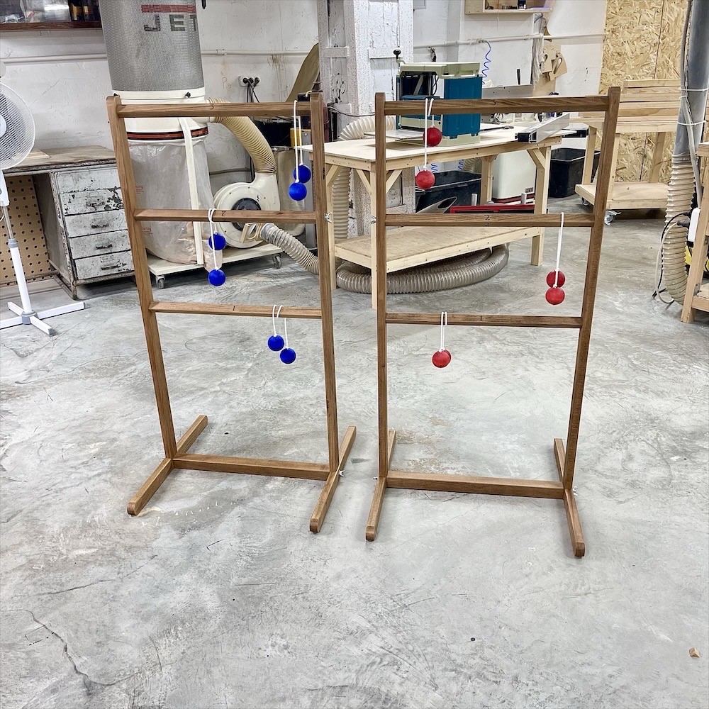 Игроки по очереди бросают связанные шары на стойку. Верхняя планка дает 3 балла, средняя 2, нижняя 1.