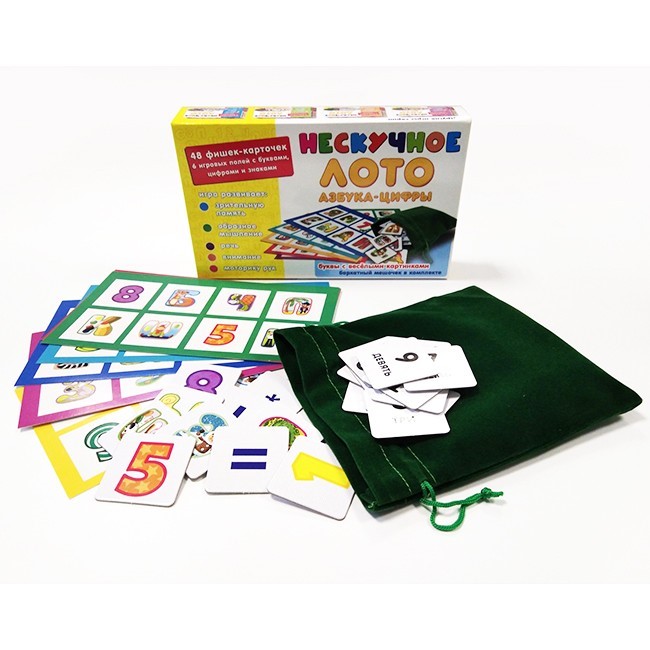 Детское лото "Азбуква-цифры" включает в себя 6 игровых полей, которые необходимо заполнить фишками с соответствующей цветной картинкой. Собирая нужную комбинацию костяшек, ребенок сможет выучить цифры и буквы, а также проявить такие качества, как внимание и сосредоточенность. Лото - общеизвестная и любимая всеми игра, которая отлично подойдёт как для семейного досуга, так и для большой шумной компании. Лото - это веселая настольная игра для дружной компании. Игра состоит из картонных игровых полей, фишек и мешочка для них. Правила лото просты и понятны, ничем не отличаются от обыкновенного лото. Ведущий поочередно вытягивает фишки, а игроки заполняют ими свои карточки. Победителем считается тот, кто быстрее всего соберет всю «коллекцию» фишек, изображенных на его карточке.