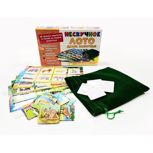 Лото - общеизвестная и любимая всеми игра, которая отлично подойдёт как для семейного досуга, так и для большой шумной компании. Яркое лото - увлекательная настольная игра для развития памяти. Лото - это веселая настольная игра для дружной компании. Лото состоит из небольших фишек и картонных игровых полей с изображением животных. Правила лото просты и понятны, ничем не отличаются от обыкновенного лото. Ведущий поочередно вытягивает фишки, а игроки заполняют ими свои карточки. Победителем считается тот, кто быстрее всего соберет всю «коллекцию» фишек, изображенных на его карточке.