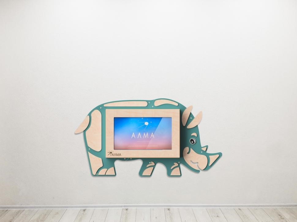 Настенная панель «Носорог» со встроенной интерактивной сенсорной панелью 32 дюйма. Это одновременно декоративное оформление стен и развивающая игрушка, ведь на панели установлен пакет игрового и обучающего ПО от АЛМА.