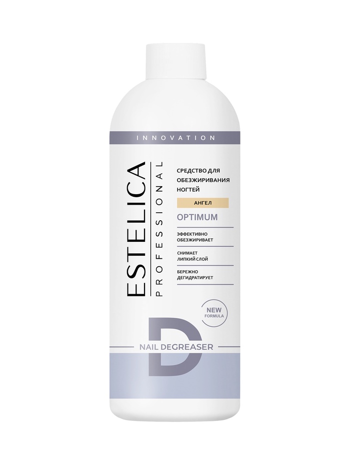 ESTELICA PROFESSIONAL OPTIMUM «Ангел», средство для обезжиривания и снятия липкого слоя 500 мл — профессиональное средство, обеспечивающее надёжное сцепление материалов с ногтевой пластиной и предотвращающее сколы и отслоения покрытия. Эффективно удаляет дисперсионный (липкий) слой и дегидратирует ногтевую пластину, делая его идеальным для натуральных и искусственных ногтей перед нанесением акрила, геля или лака.