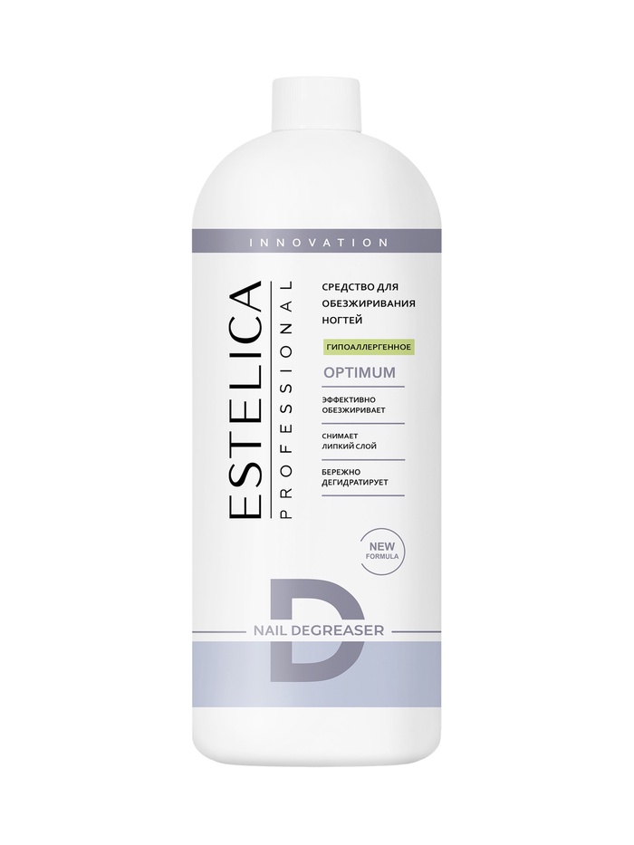 ESTELICA PROFESSIONAL OPTIMUM, гипоаллергенное средство для обезжиривания и снятия липкого слоя 1000 мл — профессиональное средство, обеспечивающее надёжное сцепление материалов с ногтевой пластиной и предотвращающее сколы и отслоения покрытия. Эффективно удаляет дисперсионный (липкий) слой и дегидратирует ногтевую пластину, делая его идеальным для натуральных и искусственных ногтей перед нанесением акрила, геля или лака.