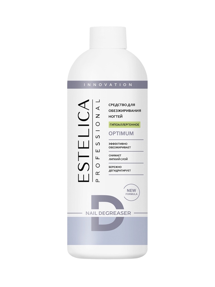 ESTELICA PROFESSIONAL OPTIMUM, гипоаллергенное средство для обезжиривания и снятия липкого слоя 500 мл — профессиональное средство, которое обеспечивает надёжное сцепление материалов с ногтевой пластиной и предотвращает сколы и отслоения покрытия. Эффективно удаляет дисперсионный (липкий) слой и дегидратирует ногтевую пластину, делая его идеальным выбором для натуральных и искусственных ногтей перед нанесением акрила, геля или лака.