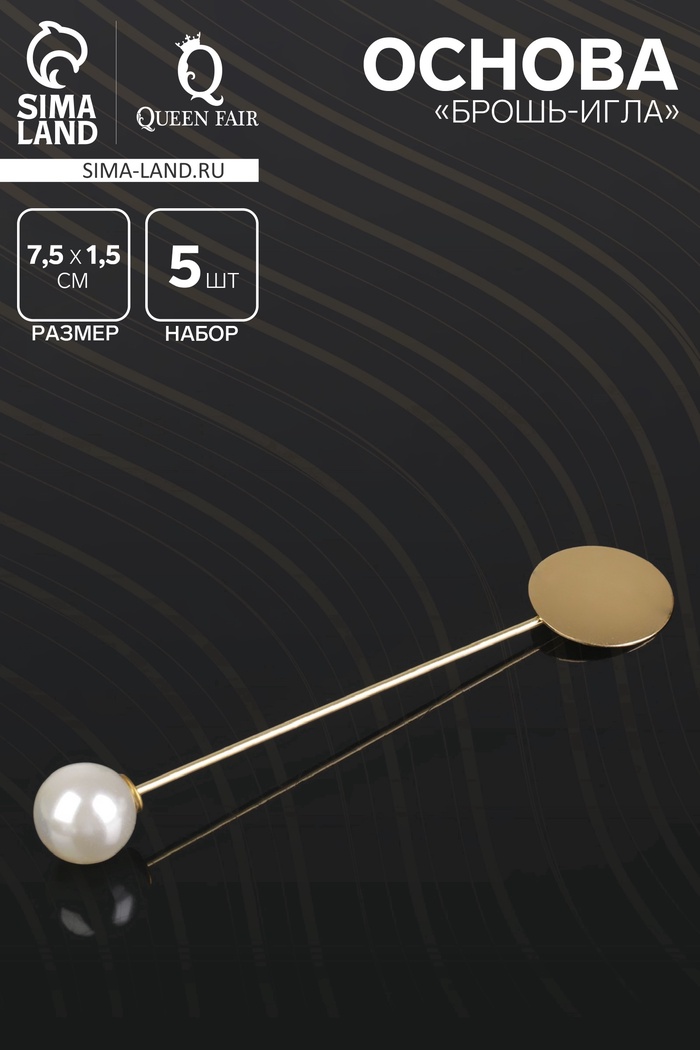 Основа «Брошь-игла» с бусиной d=1 см (набор 5 шт.), L=7.5 см, площадка 1.5 см, цвет золото