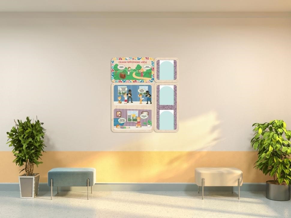 Информационный стенд для оформления стен в детских садах, начальной школе и организациях дополнительного образования. Красочные наглядные иллюстрации с простыми подписями помогут дошколятам понять правила поведения при терроризме, даже если они ещё не умеют читать. Важная информация для родителей может размещаться в акриловых карманах около каждого стенда.
