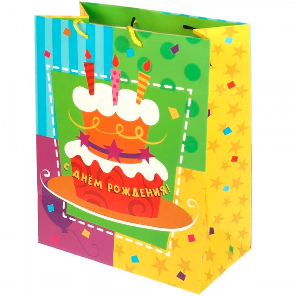 Оригинальный цветной пакет с красочным принтом позволит упаковать подарки на разные случаи.