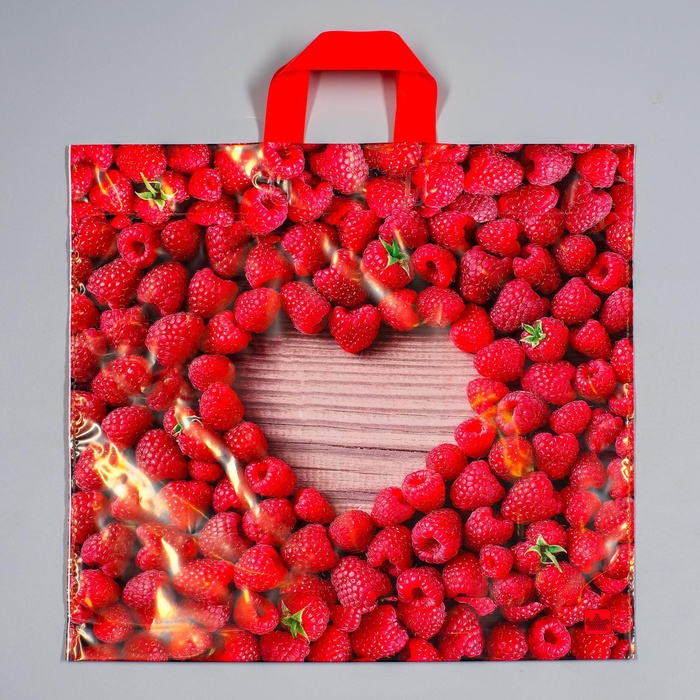 Полиэтиленовый пакет «Малина» с петлевой ручкой 44×42 см украшен сочным рисунком ягод. Его тематический дизайн и увеличенная прочность делают его идеальным для праздничных покупок.