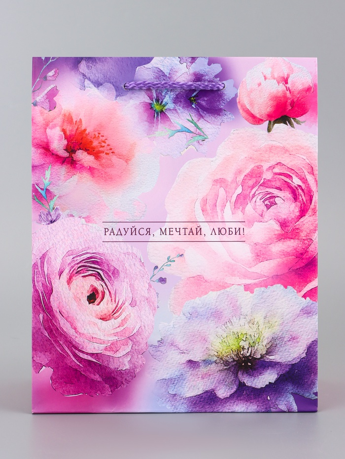 Готовое решение для цветочного подарка. Ламинированный подарочный пакет с цветочным рисунком — это упаковка, которая сама создаёт праздничное настроение. Дизайн с надписями заменяет открытку.