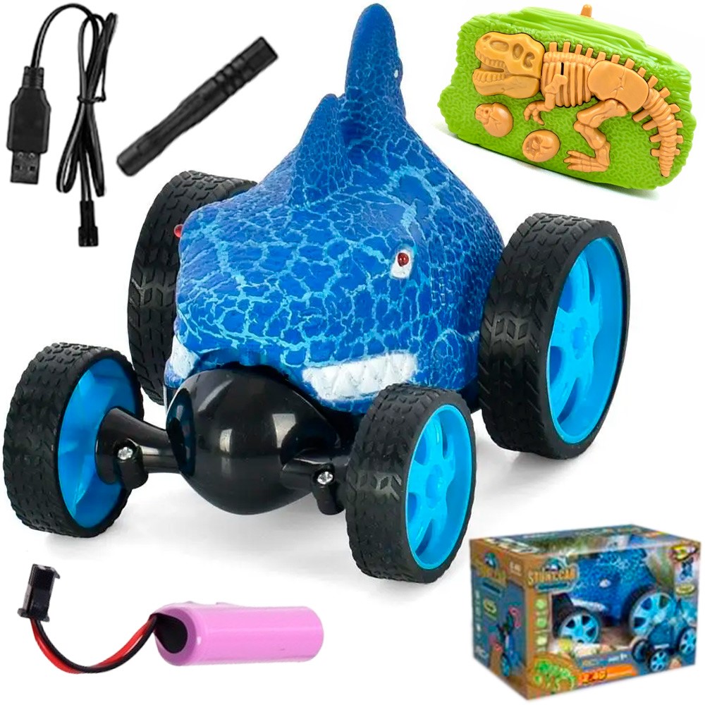 Внешний вид машины удивит как детей, так и взрослых. Кузов автомобиля выполнен в виде грозной акулы. Задние колеса больше передних, благодаря чему машина может устойчиво выполнять вращение на 360° и очень эффектно делать перевороты. Корпус машины достаточно прочный, поэтому выдержит столкновения с различными преградами. Стоит отметить еще внешний дизайн пульта. Пульт выполнен в виде окаменелого динозавра, его удобно держать в руках и легко упр