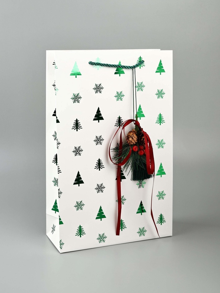 Пакет подарочный «Новогодний сюрприз», тиснение, с шишками и бахромой, 25.5×9×30 см