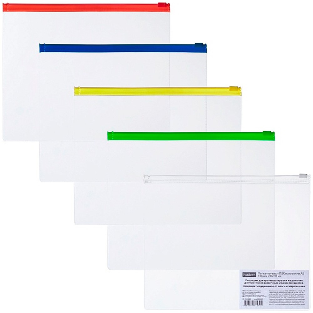Папка-конверт на молнии А5ф Прозрачная 130мкм 230х190мм Ассорти 086225