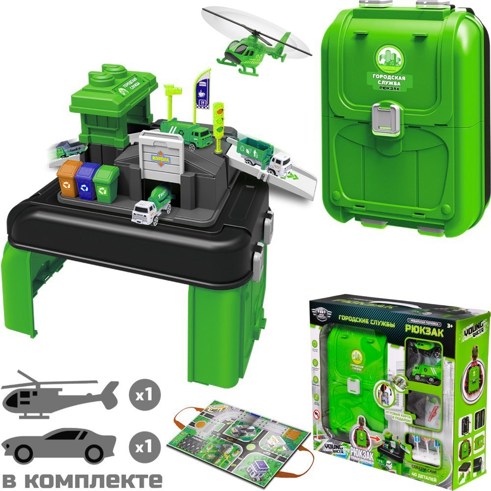 Комплектация: мобильная парковка-рюкзак (состоит из 40 деталей) – 1 шт., машинка (9 х 4,5 х 3 см) – 1 шт., вертолет (9 х 3,5 х 2,5 см) – 1 шт., игровая карта на липучке и с ручкой (57 х 37 см) – 1 шт., комплект дорожных знаков (11 х 5,5 х 3,5 см) – 1 шт.