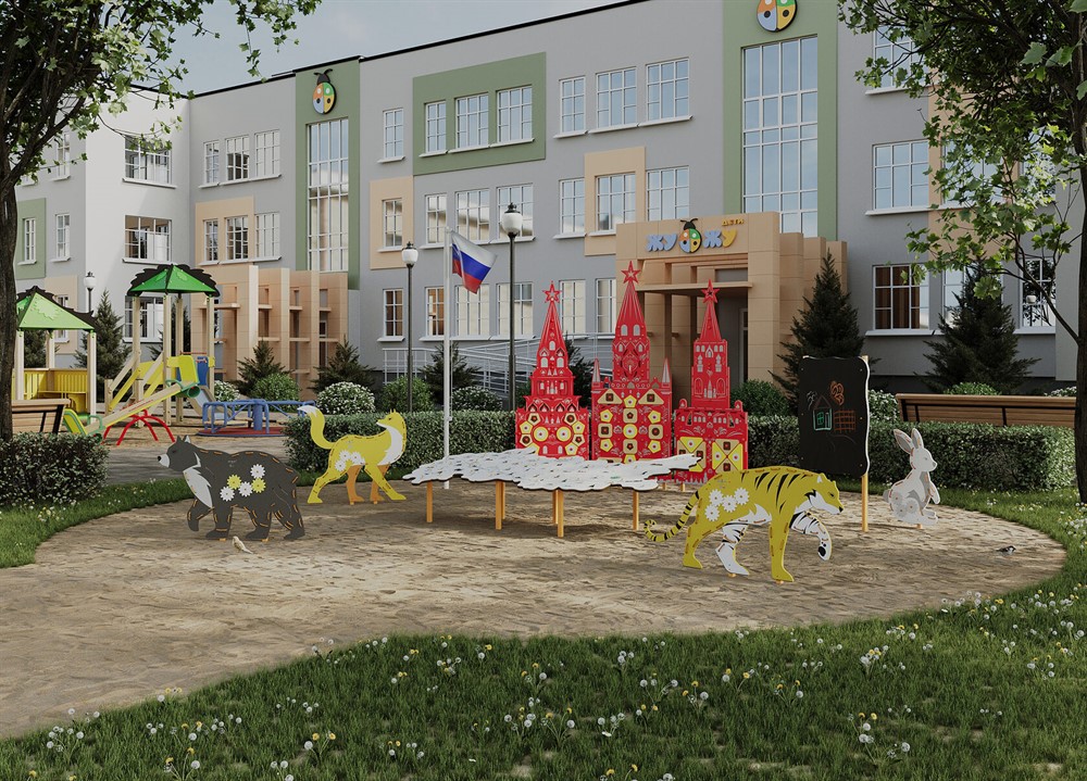 5.#nbsp;Элемент патриотической площадки "Жу-Жу" - Боровицкая башня, Кремль#nbsp;- делает патриотическую площадку ещё привлекательнее! На стене расположены съемные элементы, которые нужно сопоставить с фигурами, чтобы верно установить элемент, а также шнур.