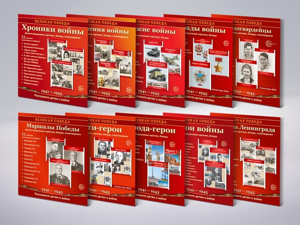 Патриотический комплект наглядных пособий «Великая Победа» создан для детей младшего школьного и дошкольного возраста. Он основан на достоверных фактах, рассказывает о героях Великой Отечественной Войны, содержит воспоминания очевидцев, повествует о великих городах, о хрониках и событиях, наградах, полководцах.