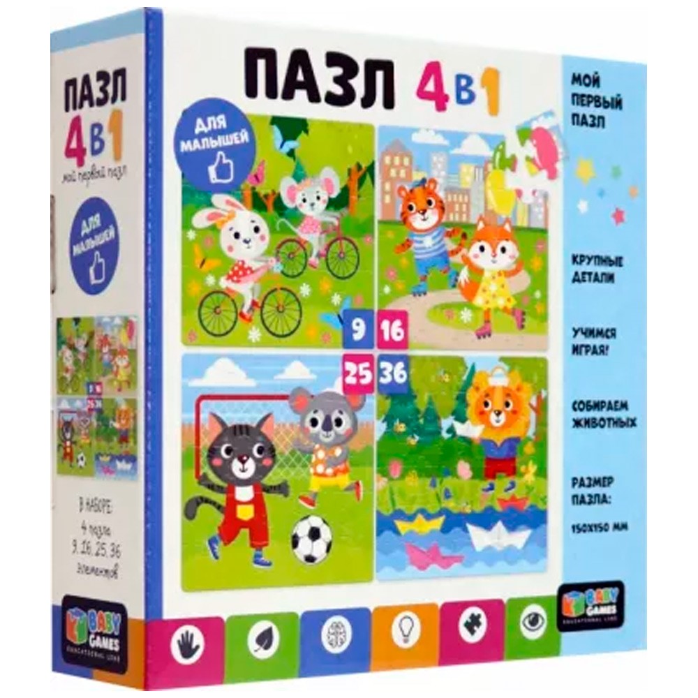 Комплектация: 4 пазла с разным количеством элементов (9, 16, 25, 36)