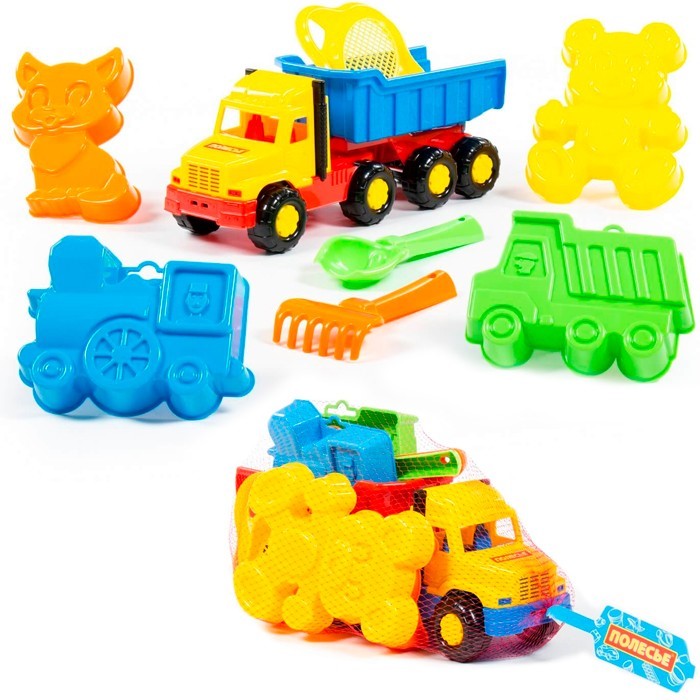 Комплектация: грузовик, сито, совок, грабли, 4 формочки
