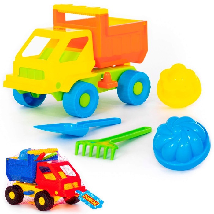 Комплектация: грузовик, 2 формочки, совок, грабли