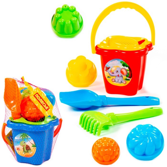 Комплектация: Ведро-цветок среднее, ситечко-цветок, лопатка №5, грабельки №5, 4 формочки