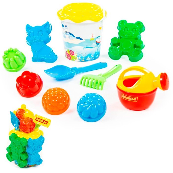 Комплектация: ведро, совок, 6 формочек, сито, лейка