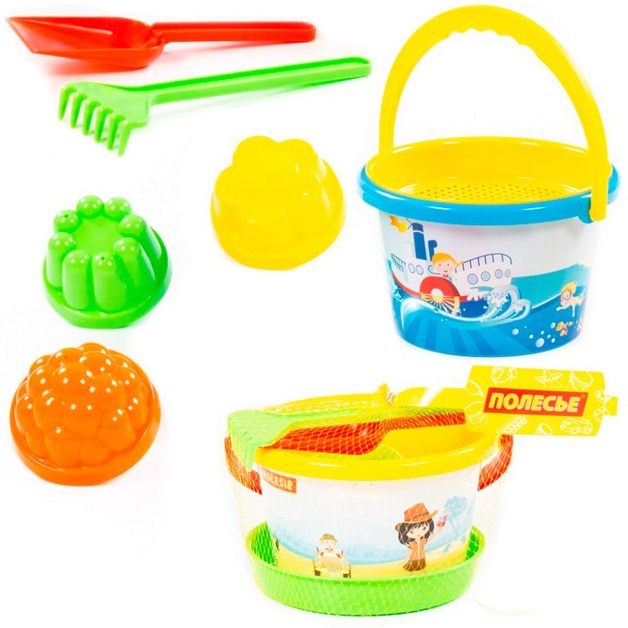 Комплектация: ведро, совок, 3 формочки, сито
