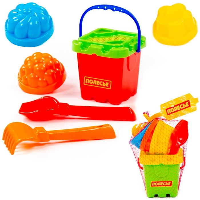 Комплектация: ведро, совок, грабли, формочка - 3 шт., сито