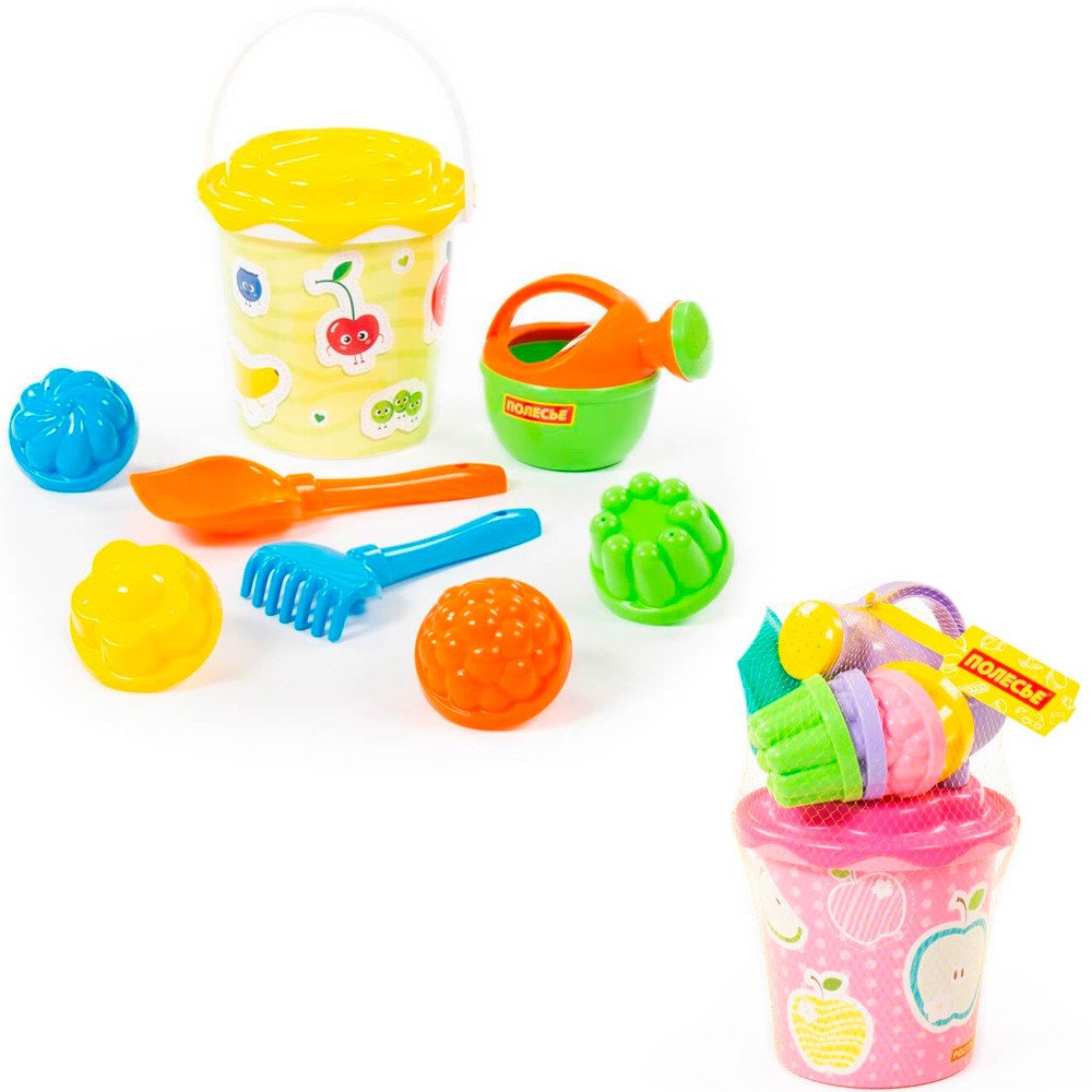 Комплектация: ведро, совок, грабли, формочка - 4 шт., лейка, сито