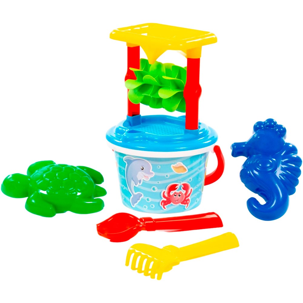Комплектация: Песочная мельница №2 с основанием, ситечко среднее №2, ведро среднее с наклейкой, совок №2, грабельки №2, формочки (черепашка + морской конек)