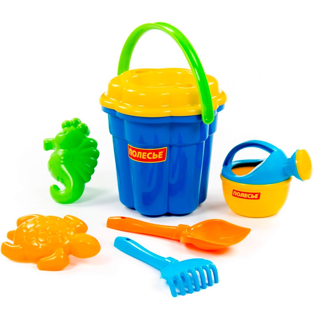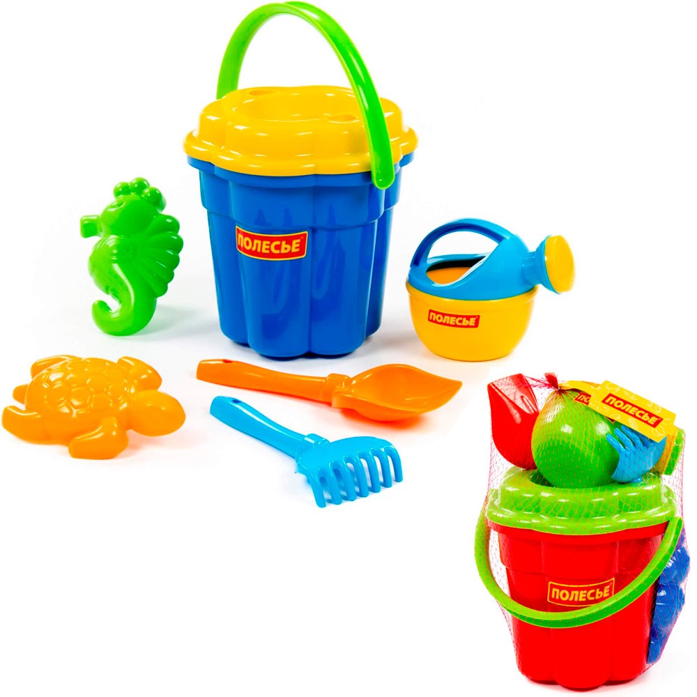 Комплектация: Ведро-цветок большое, ситечко-цветок большое, лопатка №5, грабельки №5, формочки (черепаха + морской конёк), лейка малая №4