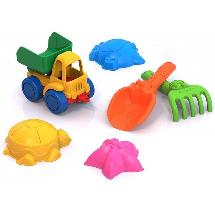 Комплектация: формочки "Морские" (арт. 029), самосвал "Нордик" (арт. 101/1), грабли (арт. 199), совок (арт. 198)