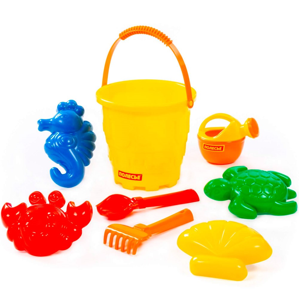 Комплектация: Ведро-замок большое, совок №2, грабельки №2, формочки (краб №2 + черепаха + морской конёк + ракушка №2), лейка малая №3