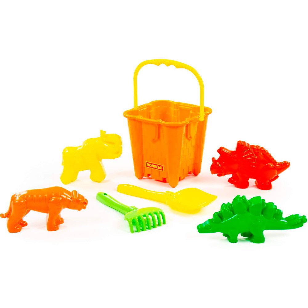 Комплектация: Ведро-замок большое №2, лопатка №5, грабельки №5, формочки (тигр + мамонт + динозавр №1 + динозавр №2)