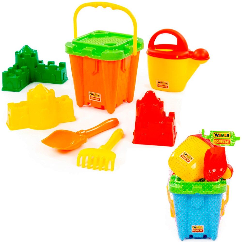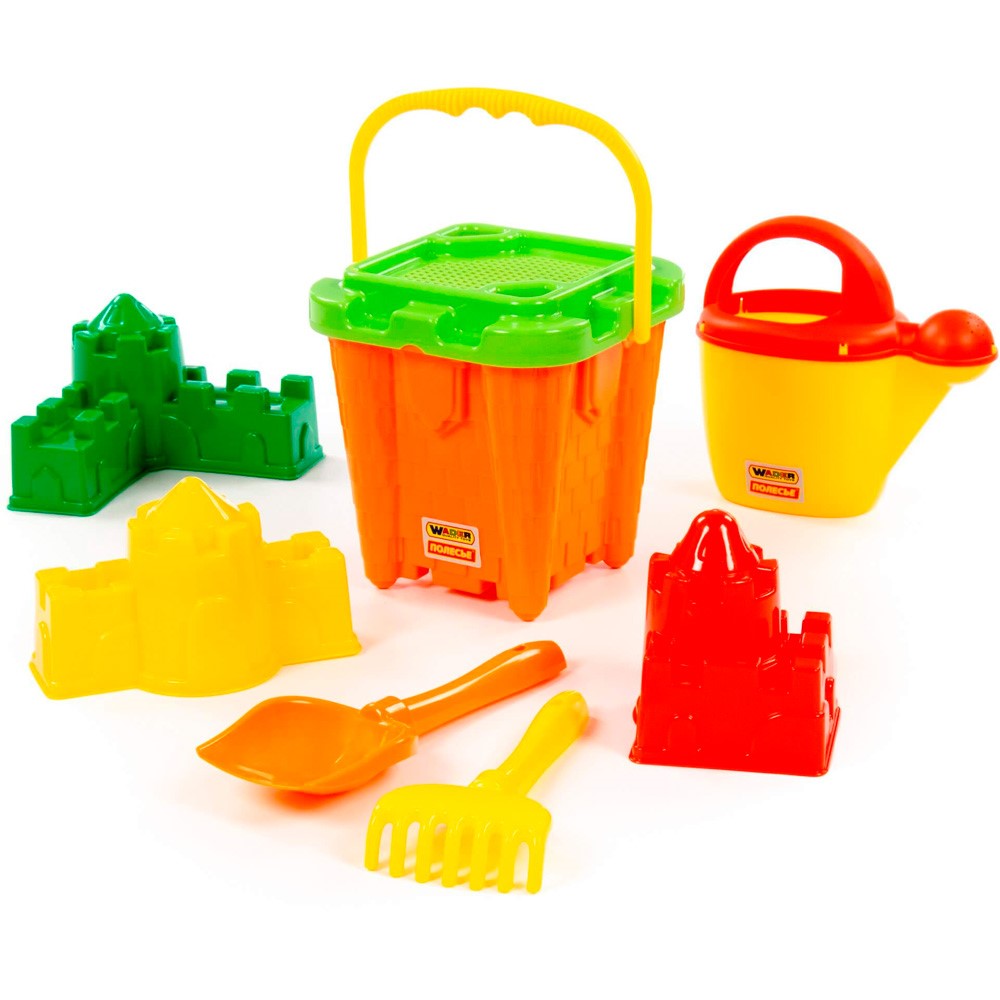 Комплектация: ведро, сито, лейка, 3 формочки, совок, грабли